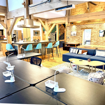 Our sewing and craft areas are arranged for smooth workflow and comfort. The first floor includes eight sewing stations with individual lighting and shared power towers; the second floor adds three more. A dedicated cutting station, two ironing setups, and a full 4'×8' design wall provide room for larger projects. A projector with Roku is available for demonstrations or relaxed evenings.